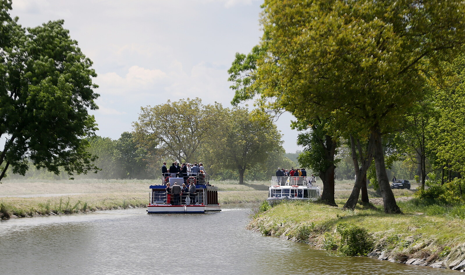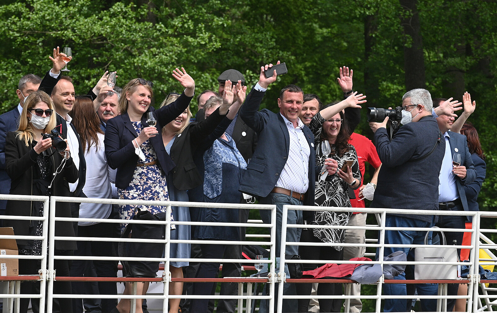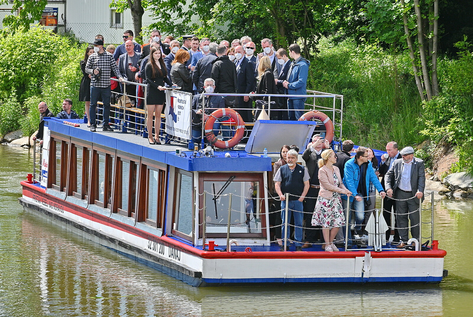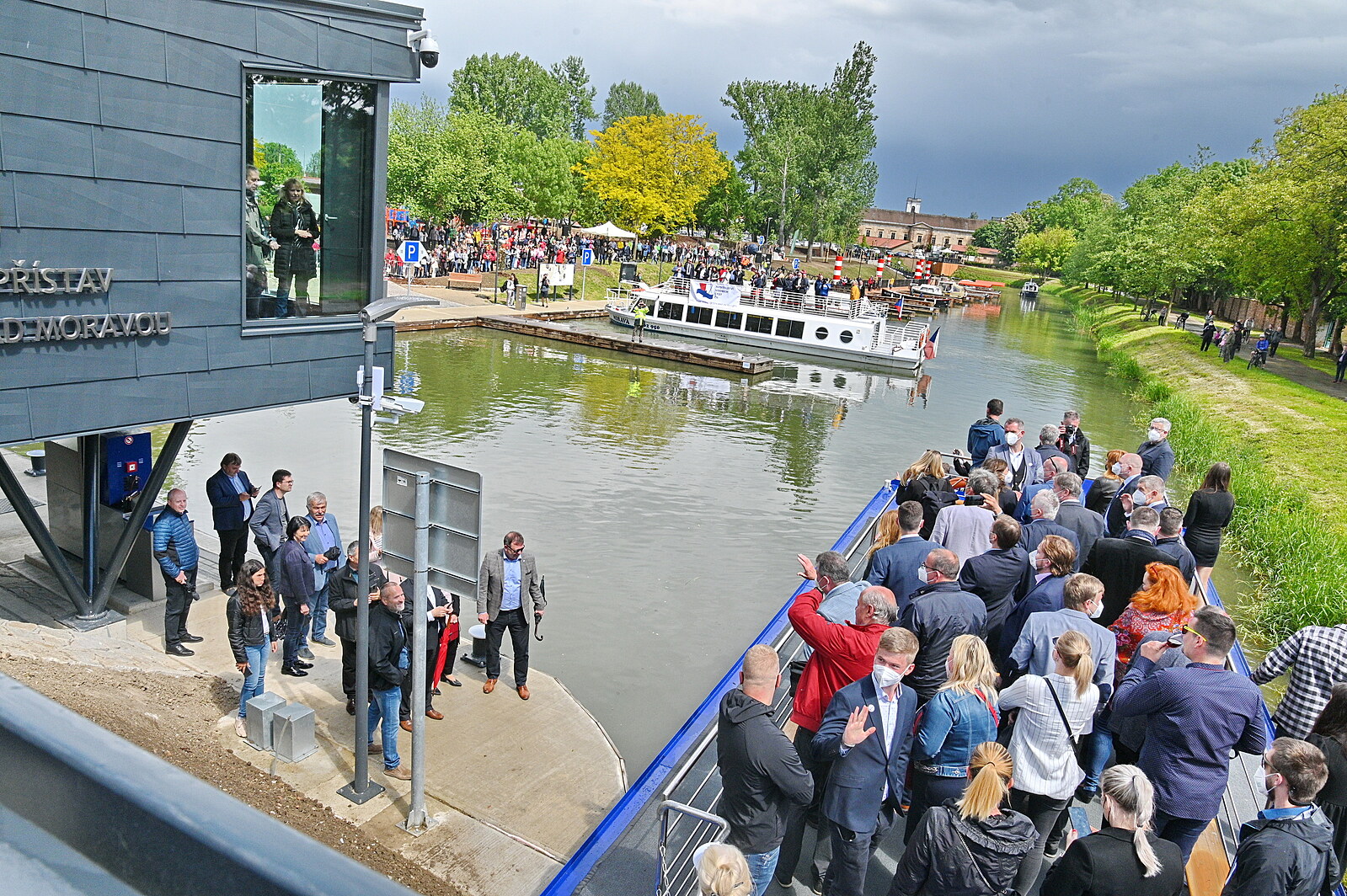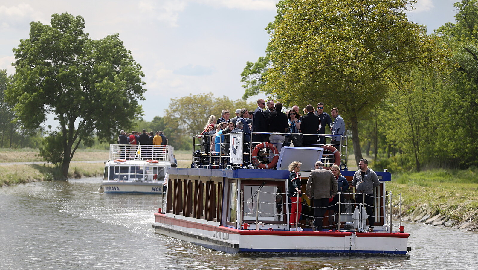 Hosté mávají z paluby jedné ze dvou lodí, které zahájily 29. května 2021 v přístaviti Vnorovy svou plavbou provoz zmodernizovaného přístavu na Baově kanále ve Veselí nad Moravou na Hodonínsku.