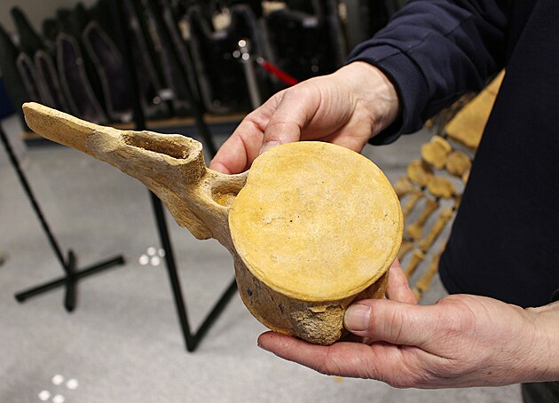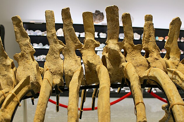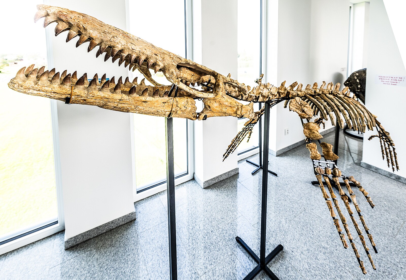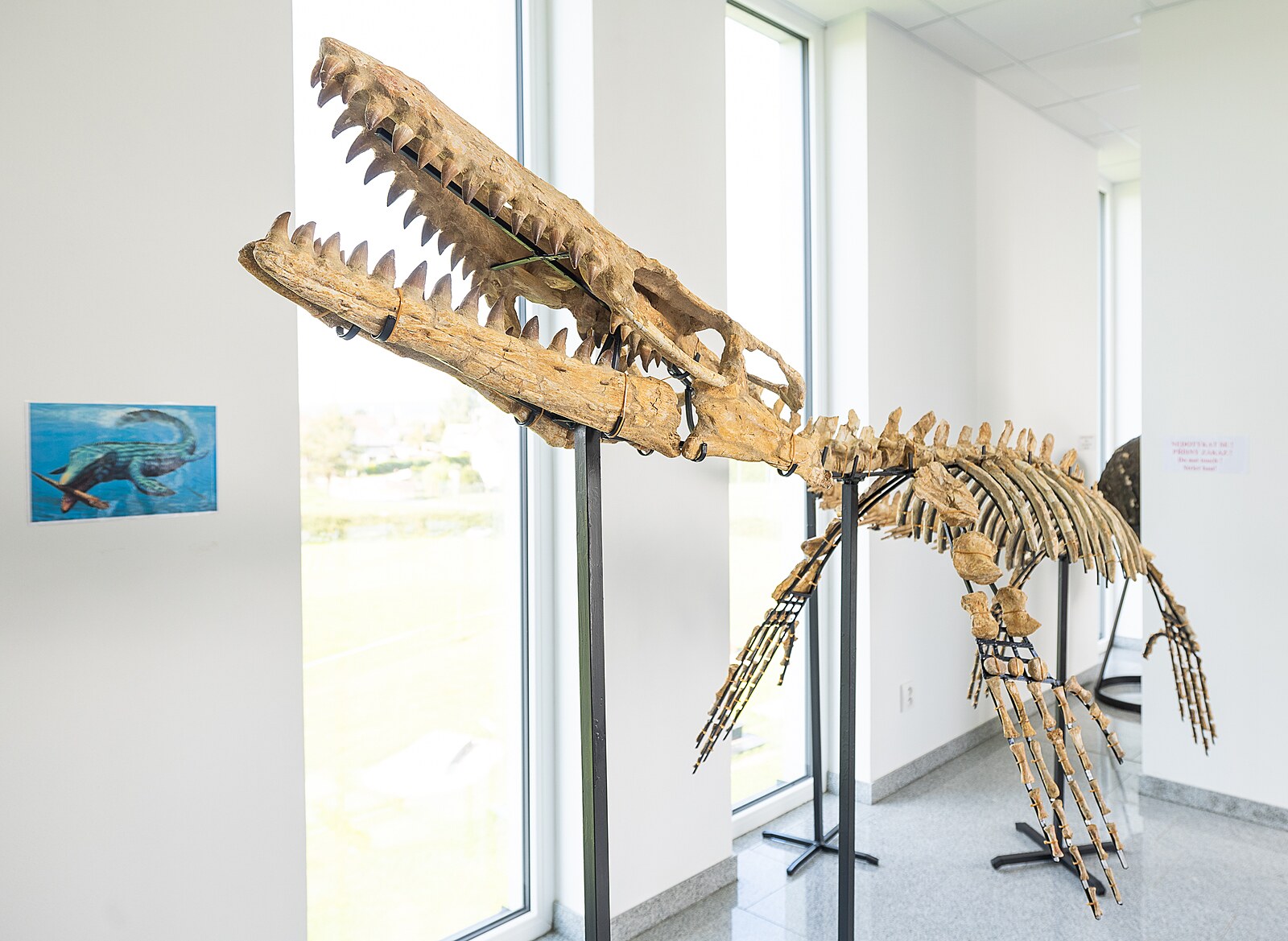 Kostra pravěkého mořského ještěra mosasaura je pozoruhodný paleontologický nález, k vidění je ve sbírce Luboše Blahy v královédvorské Galerii minerálů. (11. září 2023)