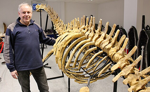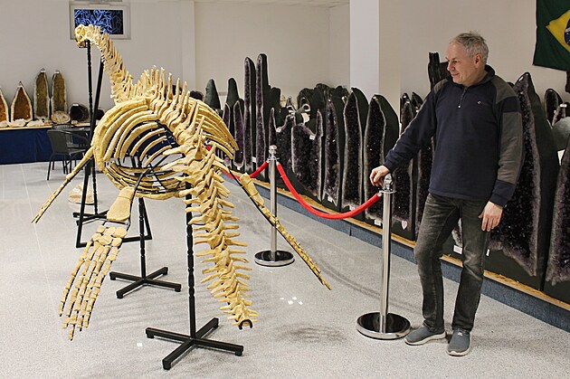 Majitel Galerie minerálů ve Dvoře Králové Luboš Blaha obohatil expozici o kostru druhohorního ještěra plesiosaura. (22. ledna 2026)