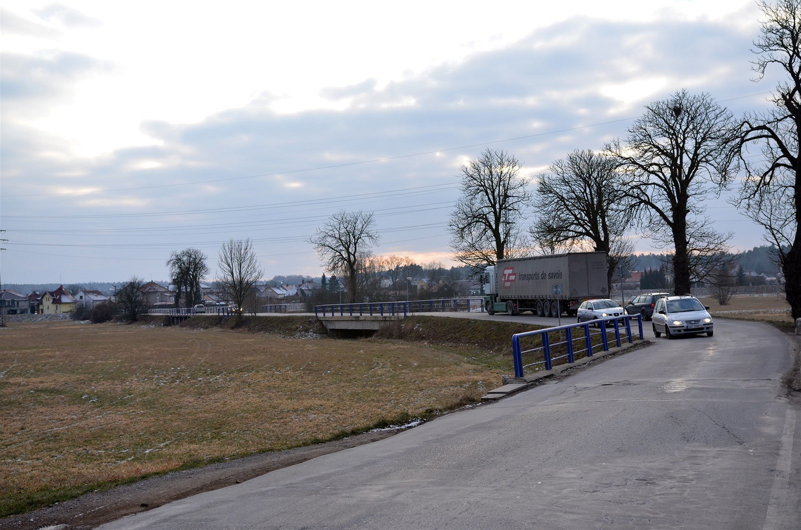 Na úzkou silnici se stěží vejdou dvě osobní auta.