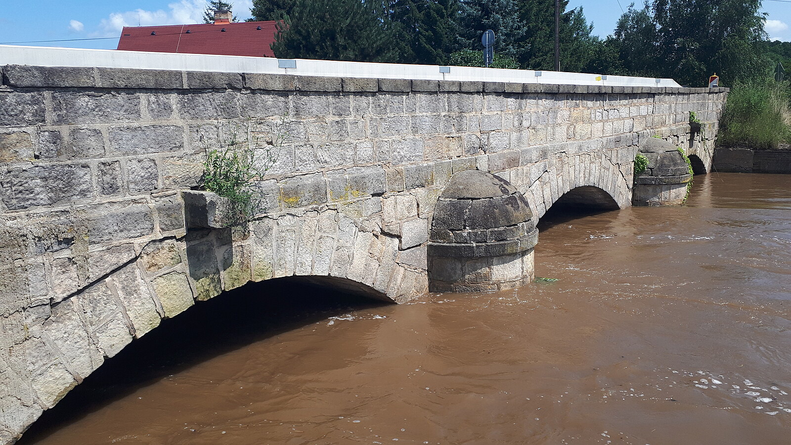 Mostní pilíře v Božíkově ukazují, jak moc hladina tamějšího potoka stoupla (18. července 2021)
