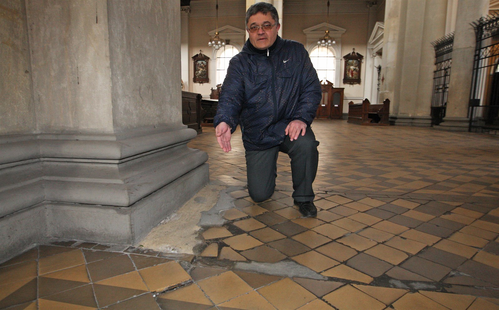 Farář Josef Plaček ukazuje, v jak špatném stavu je i dláždění katedrály.