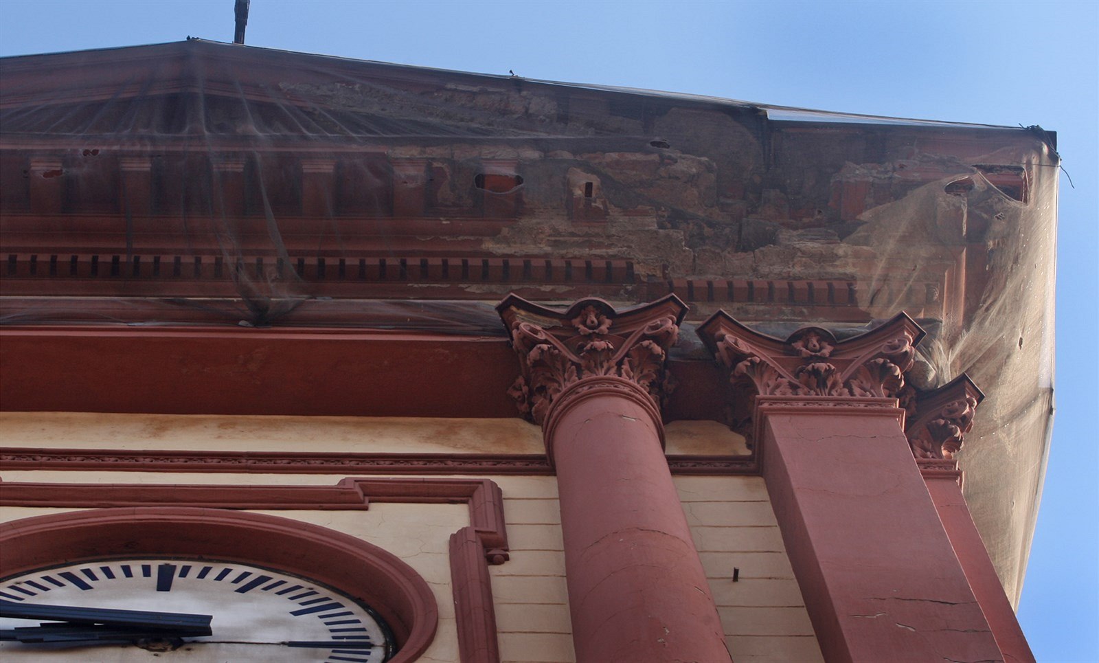 Římsy obepínají sítě, aby zachytily padající omítku a zdivo.