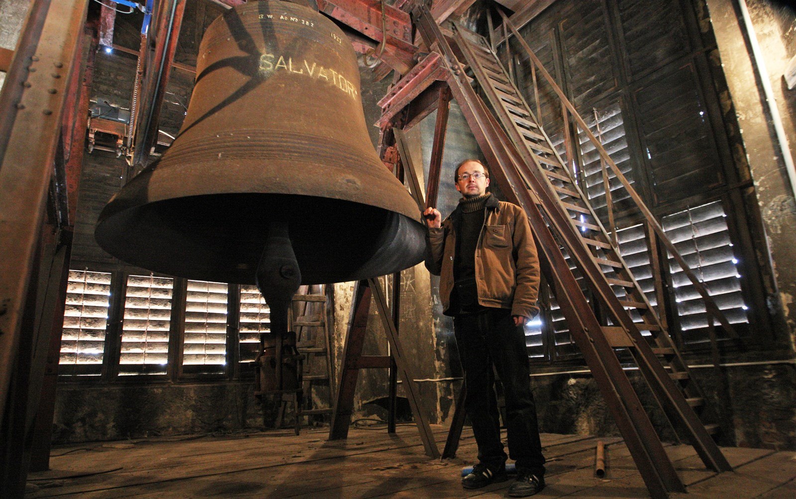 Kostelník Martin Vichnar u Salvatora, jednoho ze dvou velkých zvonů katedrály.