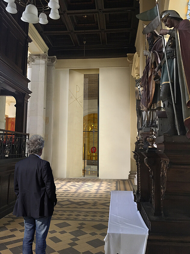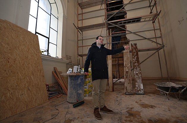 Mluvčí biskupství Ondřej Elbl v rekonstruované kapli. Přímo pod ní vykopou dělníci kryptu pro ukládání ostatků biskupů v katedrále Božského Spasitele v Ostravě. (15. leden 2026)