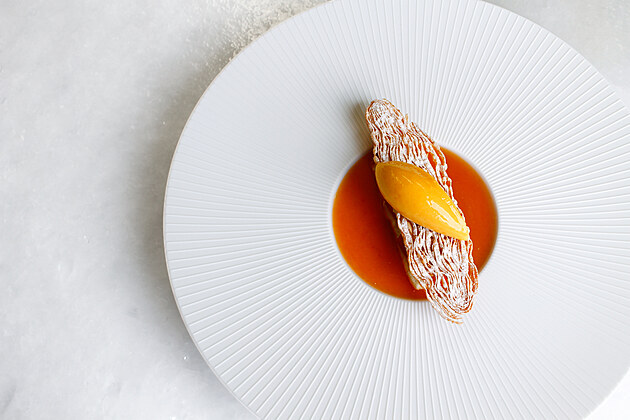 Variace na tvarohový koláč s meruňkami s domácím listovým těstem a šlehaným tvarohem od šéfkuchaře Jana Knedly z podniku Restaurant Papilio.