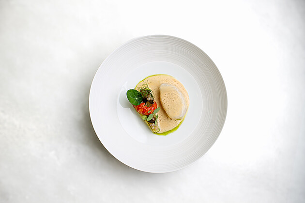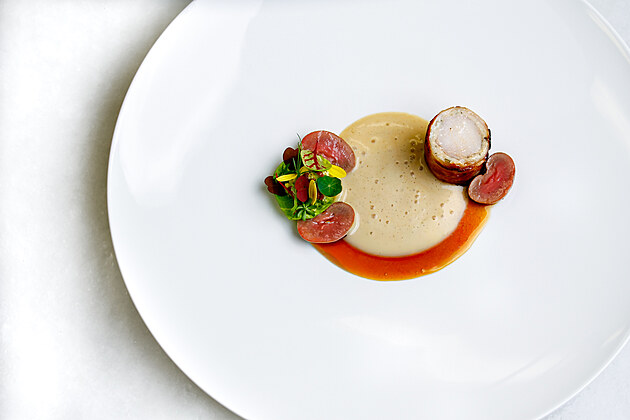 Candát s grilovaným fenyklem, šnečím masem, kaviárem a játry doplněný omáčkou z potočních raků do šéfkuchaře Jana Knedly.