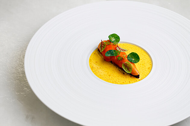 Grilovaná mrkev z farmy ve Šlapanicích s estragonovou omáčkou, pistáciemi a omáčkou z fermentované mrkve od šéfkuchaře Jana Knedly z podniku Restaurant Papilio.
