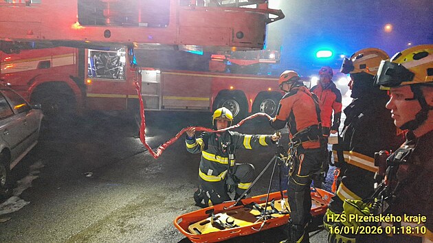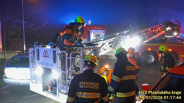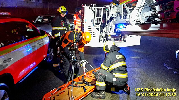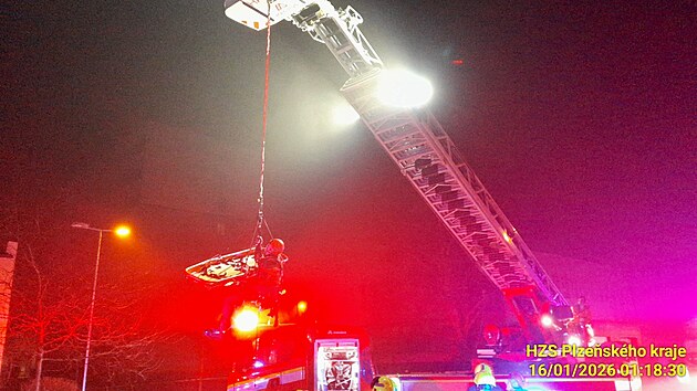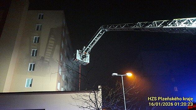 Hasiči zachraňovali ženu, která spadla z panelového domu ve Třemošné u Plzně na střechu kotelny. (16. ledna 2026)
