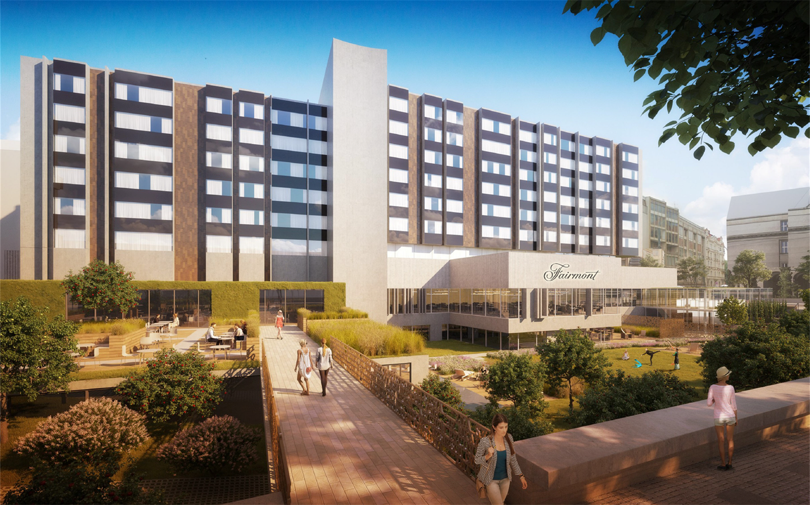 Vizualizace rekonstrukce hotelu InterContinental, pohled z nábřeží (7. listopadu 2019)