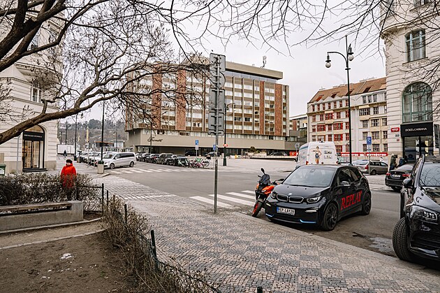 Náměstí Miloše Formana a hotel Fairmont Golden Prague u Pařížské ulice v Praze (21. ledna 2026)