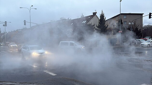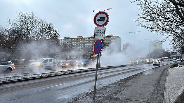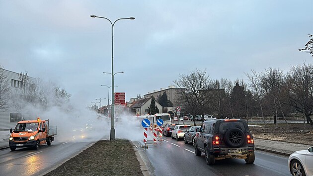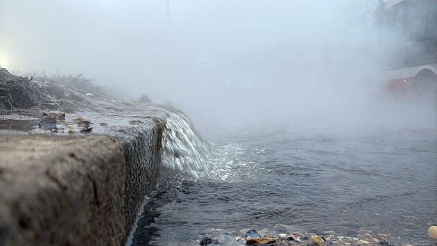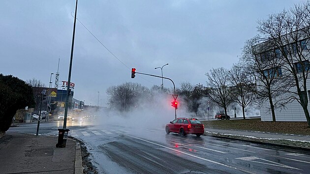 V pražské ulici Na Padesátém prasklo potrubí. (21. ledna 2026)