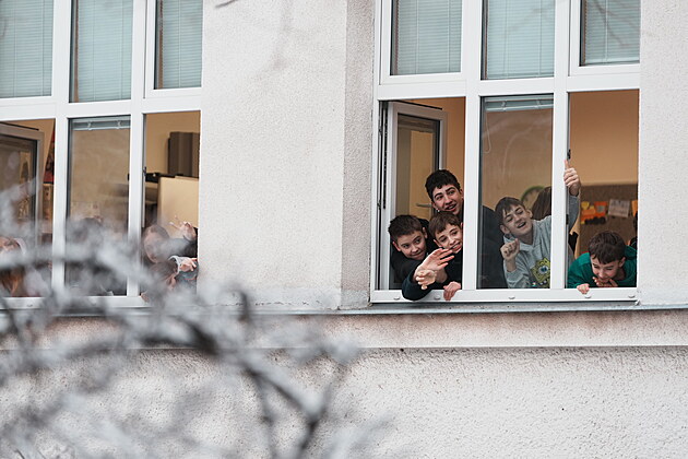 Žáci Základní školy Generála Františka Fajtla v Letňanech sledují příjezd prezidenta Petra Pavla. (17. února 2026)