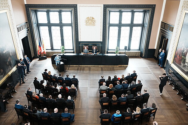 Prezident Petr Pavel společně s pražským primátorem Bohuslavem Svobodou debatuje se zastupiteli jednotlivých městských částí a zastupitelskými kluby v budově magistrátu. (27. června 2023)