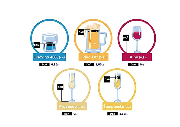 Daňový systém se však od této jednoduché logiky výrazně odchyluje. Za půllitr piva zaplatí spotřebitel na spotřební dani zhruba 1,60 Kč. U panáku vodky o objemu 4 cl se spotřební daň pohybuje kolem 6,25 Kč. U tichého vína, tedy klasického „nebublinkového“, je spotřební daň nulová. V přepočtu na jeden gram alkoholu je tak daň u lihovin zhruba čtyřikrát vyšší než u piva.