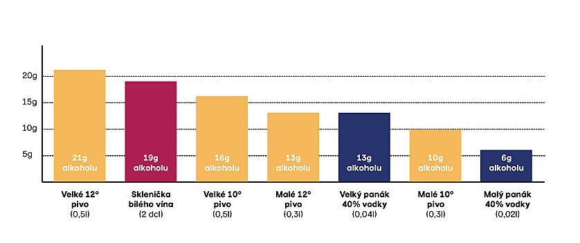 Tomu odpovídají i typické porce. Pivo pijeme po půllitrech, víno po dvou deci a lihovinu po velkém panáku, tedy 40 mililitrech. Když se přepočítá skutečný obsah alkoholu, výsledek mnohé překvapí. Půllitr desítky obsahuje zhruba 16 gramů čistého alkoholu, dvoudecová sklenka vína kolem 19 gramů a panák vodky o objemu 4 cl asi 13 gramů etanolu. Nejvíc alkoholu je tedy v běžné porci vína, za ním následuje půllitr piva a až třetí je panák lihoviny.
