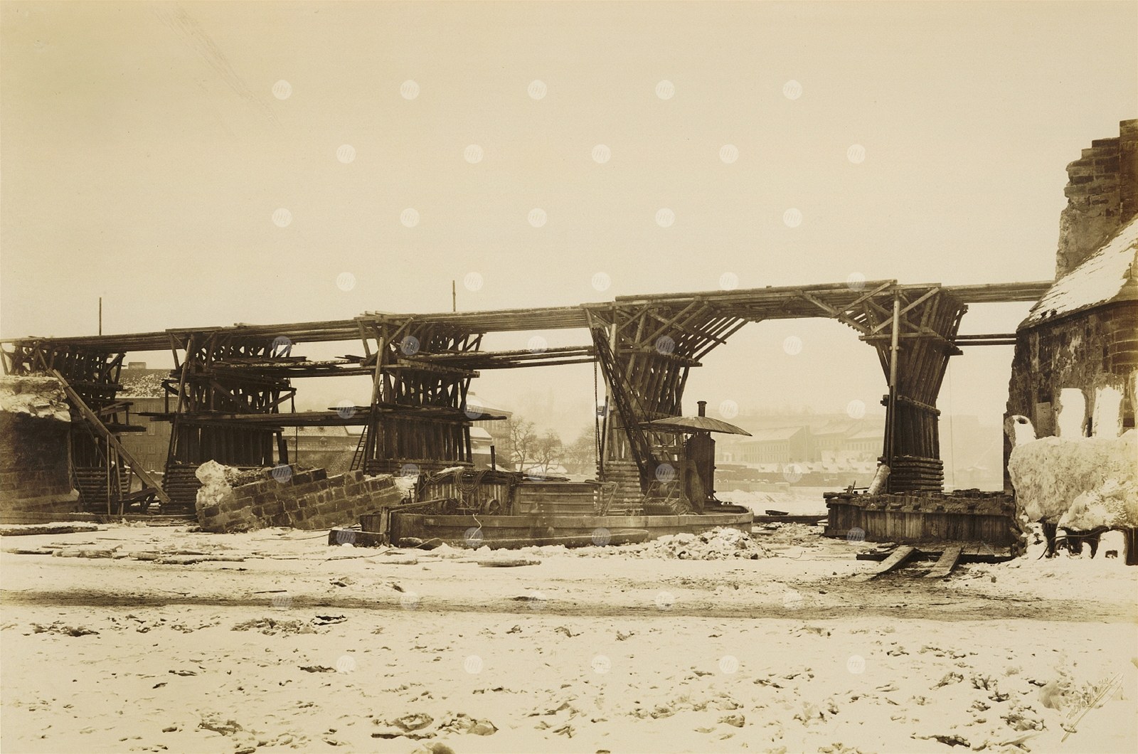 Karlův most při opravách po zářijové povodni 1890. Foto J. Eckert.