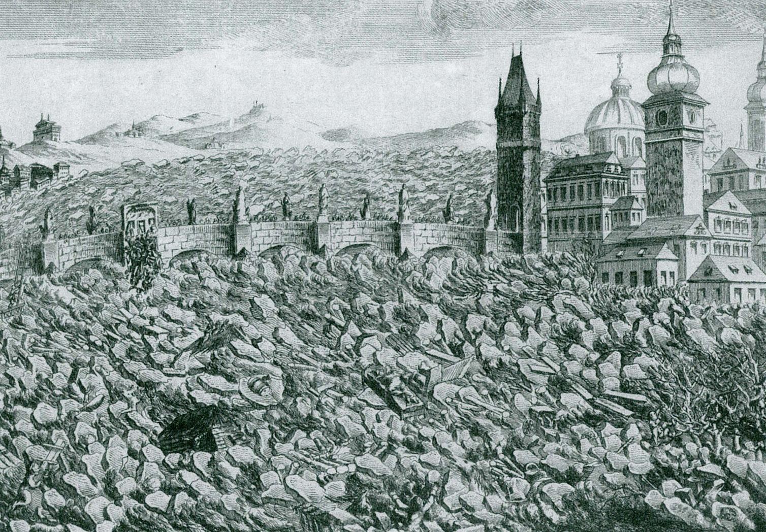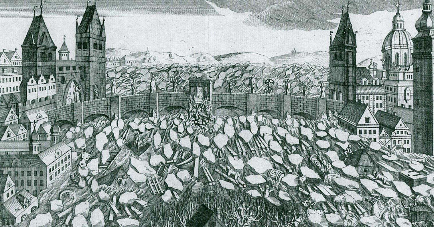 Proud ledových ker u Karlova mostu při povodni 1784