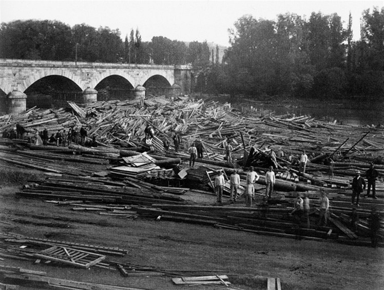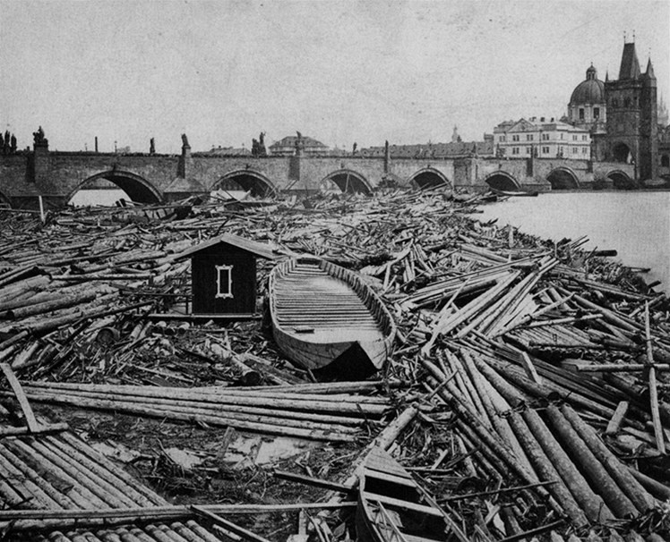Nápor dřeva na Karlův most při povodni na konci května 1872. Povodeň byla netypická odehrála se převážně jen v povodí Berounky.