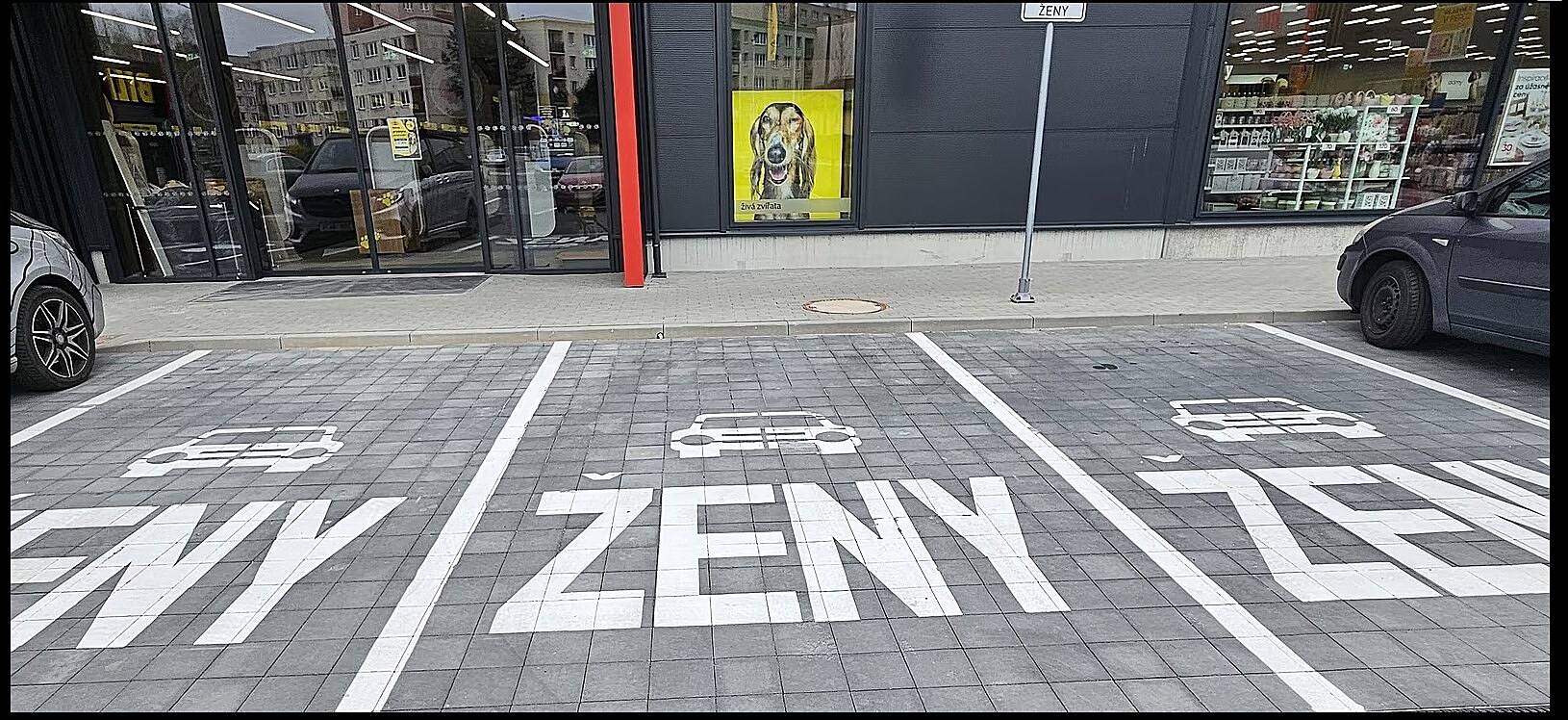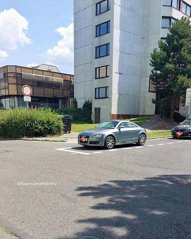 Čáry jsou namalované správně, ale řidič se netrefil. Ale šofér bílého vozu může být i bez viny, pokud někdy předtím nestál jiný automobil mimo pruhy a on se tomu jen přizpůsobil.