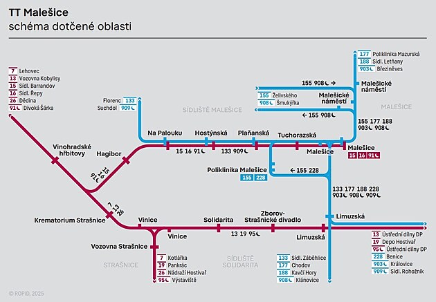 Trať Malešice a jak to pojede? Schéma budoucích linek v Malešicích a okolí Linka 6 (městská denní linka TRAM) SPOŘILOV – Teplárna Michle – Chodovská – Plynárna Michle – Michelská – Pod Jezerkou – Horky – Náměstí Bratří Synků – Nuselské schody – Pod Karlovem – Bruselská – I. P. Pavlova (C) – Škrétova (A) (C) – Muzeum (A) (C) (Z) – Muzeum (A) (C) – Václavské náměstí (A) (B) – Jindřišská – Masarykovo nádraží (B) (S) – Náměstí Republiky (B) – Dlouhá třída – Nábřeží Kapitána Jaroše (Z) – Strossmayerovo náměstí – Veletržní palác – Výstaviště (S) – NÁDRAŽÍ HOLEŠOVICE (C) (S) a dále jako linka 24 Linka 13 (nová městská denní linka TRAM) VOZOVNA KOBYLISY – Vozovna Kobylisy (T) – Líbeznická – Březiněveská – Kobylisy (C) – Ke Stírce – Okrouhlická – Vychovatelna – Bulovka – Vosmíkových – U Kříže – Libeňský zámek – Divadlo pod Palmovkou (T) – Palmovka (B) – Invalidovna (B) – Urxova – Křižíkova (B) – Karlínské náměstí – Florenc (B) (C) – Bílá labuť – Masarykovo nádraží (B) (S) – Jindřišská – Václavské náměstí (A) (B) – Muzeum (A) (C) – Muzeum (A) (C) (T) – Italská – Vinohradská tržnice – Jiřího z Poděbrad (A) – Radhošťská – Flora (A) – Olšanské hřbitovy – Želivského (A) – Želivského (A) – Vinohradské hřbitovy – Krematorium Strašnice – Vinice – Solidarita – Zborov-Strašnické divadlo – Limuzská – Nové Strašnice – Depo Hostivař (A) – Depo Hostivař (A) – Malešická továrna – Na Homoli – ÚSTŘEDNÍ DÍLNY DP Linka 15 (městská denní linka TRAM) SÍDLIŠTĚ BARRANDOV – Poliklinika Barrandov – Chaplinovo náměstí – K Barrandovu – Geologická – Hlubočepy – Zlíchov – Lihovar – Smíchovské nádraží (B) (S) – Plzeňka – Na Knížecí (B) – Anděl (B) – Arbesovo náměstí – Švandovo divadlo – Újezd – Tyršův dům (T) – Pražské Jezulátko (Z) – Malostranské náměstí – Malostranská (A) – Čechův most – Dlouhá třída – Náměstí Republiky (B) – Masarykovo nádraží (B) (S) – Hlavní nádraží (C) (S) – Viktoria Žižkov – Lipanská – Olšanské náměstí – Flora (A) – Olšanské hřbitovy – Želivského (A) – Želivského (A) – Vinohradské hřbitovy – Hagibor – Na Palouku – Hostýnská – Plaňanská – Tuchorazská – MALEŠICE Linka 16 (městská denní linka TRAM) SÍDLIŠTĚ ŘEPY (S) – Blatiny – Slánská – Hlušičkova – Krematorium Motol – Motol – Vozovna Motol – Hotel Golf – Poštovka – Kotlářka – Kavalírka – Klamovka – U Zvonu – Bertramka – Anděl (B) – Zborovská – Palackého náměstí (B) – Moráň (Z) – Karlovo náměstí (B) – Štěpánská – I. P. Pavlova (C) – Náměstí Míru (A) – Šumavská – Vinohradská vodárna – Perunova – Orionka – Flora (A) – Olšanské hřbitovy – Želivského (A) – Želivského (A) – Vinohradské hřbitovy – Hagibor – Na Palouku – Hostýnská – Plaňanská – Tuchorazská – MALEŠICE Linka 24 (městská denní linka TRAM) KUBÁNSKÉ NÁMĚSTÍ – Slavia-Nádraží Eden (S) – Koh-i-noor – Bohemians – Nádraží Vršovice (S) – Otakarova – Divadlo Na Fidlovačce – Svatoplukova – Ostrčilovo náměstí – Albertov – Botanická zahrada – Moráň (Z) – Karlovo náměstí (B) – Novoměstská radnice (T) – Lazarská (B) – Vodičkova – Václavské náměstí (A) (B) – Jindřišská – Masarykovo nádraží (B) (S) – Bílá labuť – Těšnov – Štvanice – Vltavská (C) (S) – Vltavská (C) (S) – Holešovická tržnice – Tusarova (Z) – Dělnická – U Průhonu (T) – Ortenovo náměstí – NÁDRAŽÍ HOLEŠOVICE (C) (S) a dále jako linka 6 Linka 34 dočasná linka zrušena – nahrazena provozem linky 24 Linka 91 (městská noční linka TRAM) DIVOKÁ ŠÁRKA – Vozovna Vokovice – Nad Džbánem – Nádraží Veleslavín – Červený Vrch – Sídliště Červený Vrch – Bořislavka – Na Pískách – Hadovka – Thákurova – Dejvická – Vítězné náměstí – Hradčanská – Sparta – Korunovační (Z) – Letenské náměstí – Kamenická – Strossmayerovo náměstí – Nábřeží Kapitána Jaroše (T) – Dlouhá třída – Náměstí Republiky – Masarykovo nádraží – Jindřišská – Václavské náměstí – Vodičkova – Lazarská – Novoměstská radnice (Z) – Karlovo náměstí – Štěpánská – I. P. Pavlova – Náměstí Míru – Šumavská – Vinohradská vodárna – Perunova – Orionka – Flora – Olšanské hřbitovy – Želivského – Želivského – Vinohradské hřbitovy – Hagibor – Na Palouku – Hostýnská – Plaňanská – Tuchorazská – MALEŠICE Linka 133 (městská denní linka BUS) FLORENC (B) (C) – Pernerova – U Památníku – Tachovské náměstí – Lukášova – Černínova – Ohrada – Biskupcova – Basilejské náměstí – Olgy Havlové – Malešická – Třebešín – Na Palouku – Hostýnská – Plaňanská – Malešice – Limuzská – Donatellova – Skalka (A) – Na Padesátém – Nádraží Zahradní Město (S) – Zahradní Město – Centrum Zahradní Město – Hlohová – Poliklinika Zahradní Město – Jesenická – SÍDLIŠTĚ ZÁBĚHLICE Linka 188 (městská denní linka BUS) SÍDLIŠTĚ LETŇANY – Ivančická (T) – Avia Letňany – Staré Letňany – Rychnovská – Boletická – Výstaviště Letňany – Letňany (C) – Letňanská – Nový Prosek – Prosek (C) – Nad Jetelkou – Vysočanská (B) (S) – Nádraží Libeň (S) – K Žižkovu – Balkán – Spojovací – Pod Táborem – Botanická zahrada Malešice – Malešické náměstí – Malešice – Limuzská – Dobročovická – Strašnická (A) – Na Hroudě – Staré Strašnice – Korytná – 