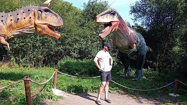 Pak tu máme samotné exponáty. Těch je kolem sedmdesáti, většina se poměrně sofistikovaně hýbe, a například apatosaura, stegosaura, mamenchisaura, ankylosaura i zmiňovaného tyranosaura můžete pozorovat v životních velikostech. A to se bavíme o pořádných maccích, kteří mají někteří na délku skoro dvacet metrů. Naproti tomu v DinoParcích, a zejména v tom pražském, se na velikost exponátů zase tolik nehraje. Dinosauři jsou opravdu obři. A třeba takového triceratopsa, který byl za dávných časů vysoký tři metry a na délku měřili asi osm metrů, nenajdete, alespoň myslím, v životní velikosti v tuzemsku vůbec nikde.