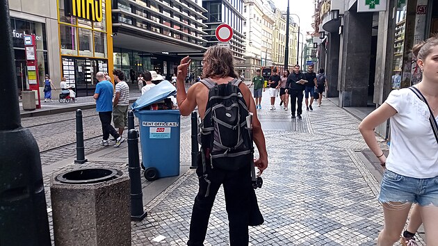 Další úlovek z okolí Máje. Ve Spálené ulici se pohyboval muž takzvaně nahoře bez, záda měl ovšem krytá batohem. Možná bych ho minul bez povšimnutí, ale byl to jeden z těch, kteří na ulicích mluví sami pro sebe. Tento nemluvil, ale křičel, nebo spíše vyhrožoval. Naštěstí jen slovně.