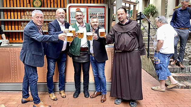 Vpravo připíjí františkánský farář Filip