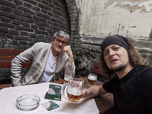 Gastronaut Pavel Maurer a editor deníku Metro popíjí a zároveň pracují.