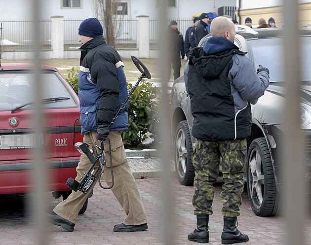 Den po vraždě. Policisté prohledávají prostor v Durychově ulici, kde byl předchozí večer zastřelen před sídlem svých firem František Mrázek.